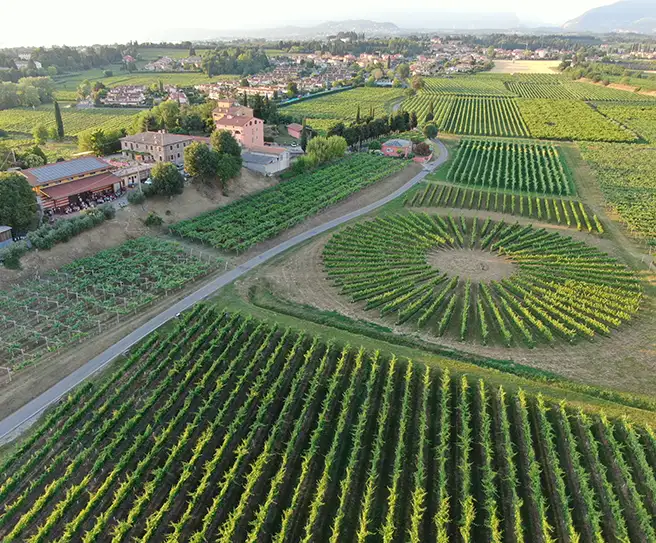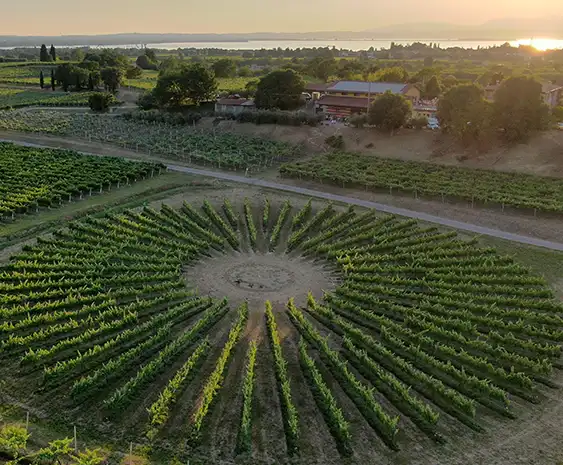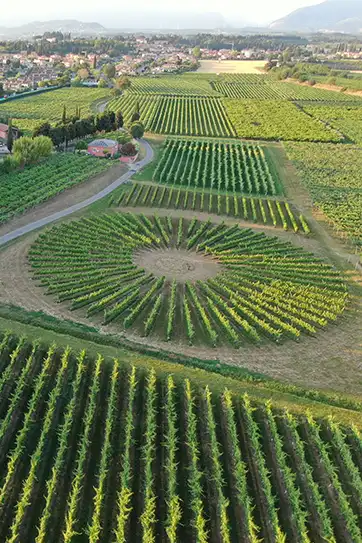 Vigneto rotondo impiantato ai piedi della collina. Un vigneto progettato come un grande palcoscenico naturale, dove ogni filare converge verso il cuore della scena, un’arena della natura e del tempo, dove la terra, il clima e il sapere si incontrano per mettere in scena il vino.